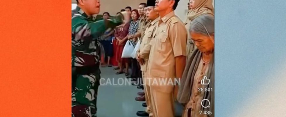 Beredar video di media sosial Facebook yang menampilkan seorang anggota TNI memarahi kepala desa karena diduga menyalurkan bantuan sosial (bansos) tidak tepat sasaran. Unggahan tersebut ramai diperbincangkan warganet dan telah mendapatkan puluhan ribu tanda suka serta ribuan komentar.